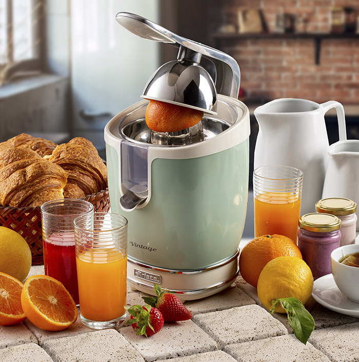 Snažan, tih i nepogrešivog dizajna: električni sokovnik za citruse Vintage opremit će vašu kuhinju retro i shabby chic stilom tipičnim za liniju Vintage by Ariete , zahvaljujući svom otpornom metalnom kućištu i dragocjenim kromiranim završecima. Set uključuje 2 korneta za veliko i malo voće : veliki kornet od nehrđajućeg čelika idealan je za naranče i grejpfrutove, a mali kornet ima iglu za praktično zaključavanje čak i najmanjeg voća, poput limuna i limete. Profesionalni aparat za cijeđenje agruma s polugom za pritisak lako drobi voće i osigurava profesionalno cijeđenje. Izljev od nehrđajućeg čelika koji štiti od kapanja sprječava rasipanje soka i jamči besprijekorno čišćenje potpornih površina. Sok od naranče za doručak savršen je za punjenje vitaminom C, mineralnim solima i energijom!